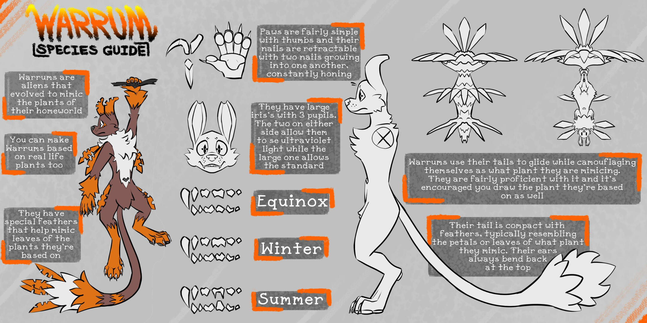 <[WARRUM ANATOMY]>Warrums stand roughly 1.2m tall with a tail that stretches roughly the same length, ending in a tuft of tightly packed feather fluff. The species will walk on two legs for most of their daily life, but when running they will resort to all fours. Their limbs are clawed with nails that grow in two parts, growing together and self sharpening to resemble the tip of a fountain pen. Warrums evolved to mimic the plant life of Nuoko in order to camouflage themselves, so as a result, there are tons of different Warrum populations that vary drastically depending on what plant they evolved to mimic.Much like most of the creatures of Nuoko, Warrums have feather plumage that serves a variety of purposes, from keeping warm, to camouflage, to transportation. Since Nuoko is an incredibly windy planet full of jet streams, wind tunnels, and serious storms, Warrums evolved to make use of the airflow like a lot of other creatures. However instead of flying with wings, they use a much different method.At the end of a Warrums tail is a compact ball of feather fluff that resembles a dense cotton ball, but in reality, they are large feathers connected to numerous muscles inside their tail that can force them out to resemble a gigantic blooming flower. When unfurled, the tail fan is nearly the size of their body and can easily catch the draft, pulling them in the direction of the wind while their dangle upside down. They can control what direction they're going by those tail muscles and glide to their desired landing area. Among the variations are distinct subspecies that have tail fans designed for different purposes.Warrum eyes are very different as well, being able to see the color spectrum, and also ultraviolet light. Each eye has three different pupils, a main one in a center responsible for night vision and detecting colors, and two smaller ones that train light specifically to specialized optical cells meant for seeing the ultraviolet spectrum. Their sense of smell and hearing are also really keen, but not as much as their vision.Warrums do not have a strict male and female gender, the many creatures of Nuoko rarely do on account of how difficult it is to survive. Each individual is hermaphroditic, possessing both biological functions needed to reproduce in the same body. Warrums also share similarities with Marsupials, possessing a pouch for their young to develop in on their naval. Warrums will adopt characteristics of both sexes if it suits their personalities.Warrums have strange internal anatomy. They do not have centralized brains, instead having neural tissue in the abdomen and under their rib cages. While this gives them plenty of room in their heads for their large eyes, as well as making them much less vulnerable to death, it has the caveat of making them very sensitive. When things hurt, they hurt twice as much as normal. They also have an entire body system dedicated to cleaning. Their skin secretes its own disinfectant that eliminates odor, cleans their plumage of dust and dirt, and gives them a smell reminiscent of charcoal that the species can somehow distinguish individuals from.Warrums born around their planet's solstice will be born with a special set of teeth depending on which season it is. Winter Warrums will have tough, grinding molars meant for breaking open the tough seed pods of the season, and summer warrums will have sharp molars meant for stripping a special vine that grows in the summer. Equinox Warrums will have both sets but they are less efficient at either task. Baby Warrums are called JoeysThere are more details involving their reproductive system, but viewer discretion is advised. You can find this information by clicking the button below.