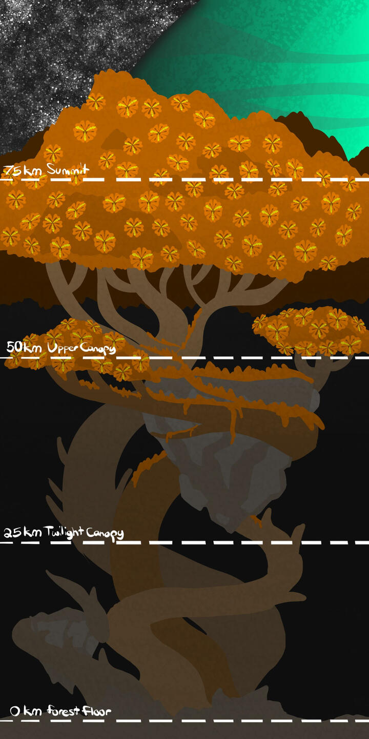 <[THE WARRUM HOMEWORLD]>Warrums come from a semi-dark world called Nuoko. Nuoko is an incredibly diverse world locked in a near constant twilight with only a small sliver of the world getting sunlight. The reason for Nuoko being mostly dark is on account of the planet actually being a moon for a gas giant known locally as “Orvuun.” Nuoko is orbitally locked behind Orvuun and as a result, life has adapted to low light levels. Many of the Creatures living on Nuoko have evolved acute vision, with the 4 main animal families being well adapted to vision using infrared, Ultraviolet, and compound eyes.Nuoko has 34 hour days with 8 of those hours being light, and the rest being twilight and darkness. The atmosphere of Nuoko has taken on a strange layer that seems to refract light around the planet about halfway. The foliage has also adapted very alien qualities as a result of the lack of sunlight, and as a result, forests tower several thousand feet into the sky, ripping up chunks of continents to suspend islands in different layers of the canopy. Because of this particular ecosystem, the world is very hard to traverse with large rifts in the crust, islands, and wind tunnels.The foliage of the planet grows black with special parts around the high canopy that flower outward in vibrant colors. Each day, the forest does this, it rains down petals and leaves with the rising and setting sun, making the planet incredibly beautiful to see in person as well as from space and filling the wind channels with a constant flow of saplings, petals and debris. However, the world is also considerably dangerous, home to desperate creatures snagging whatever prey they can while they can see it the best, numerous airborne predators that ride the winds of the world and swarm, and carnivorous plants that will kill you very quickly if you tread too close.The landscape of Nuoko is a lot more stable on the continental coastline with wetlands and mangroves being more commonplace as well as the planets tropics, home to large prairies, jungles, and islands. There are telltale signs off sentient activity with lights pouring out from clusters around certain areas, but there is very little traffic in the planets orbit with only 2 space stations. Nuoko doesn't have cities as Warrums are still very solitary creatures, but they do have large colony bastions that serve less as towns, and more as glorified rec rooms and rest stops.